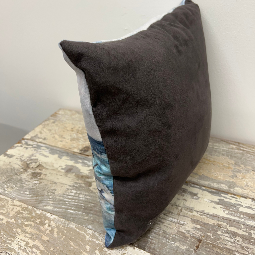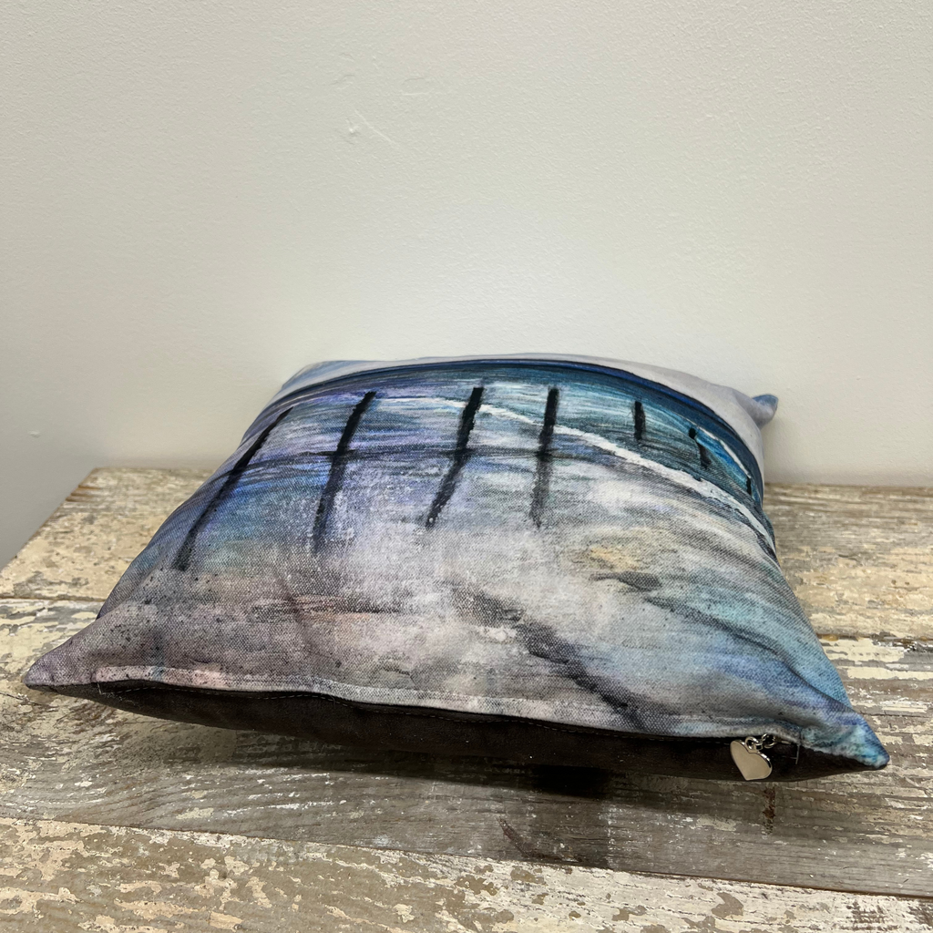 - Hand-finished, filled cushion featuring a print of original artwork Portstewart Strand.